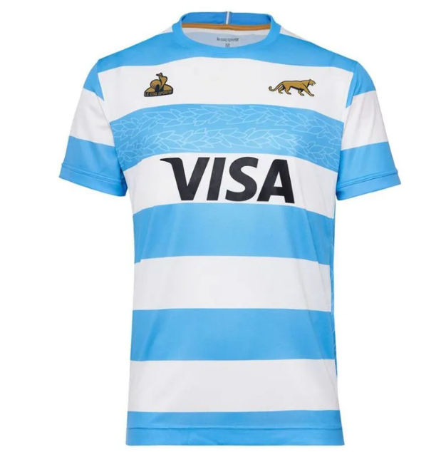 La camiseta titular de Los Pumas mantiene las características franjas horizontales celestes y blancas inspiradas en el color de nuestra bandera y un cuello redondo celeste.