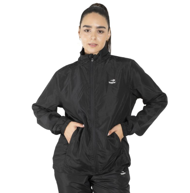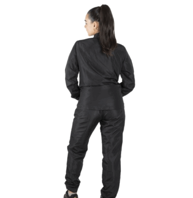 Conjunto básico New II. Mujer. Campera con recortes laterales y bolsillos. Pantalón recto con bolsillos laterales. Logos a contratono en ambas prendas. Telas: Microfibra liviana + forrería de mesh – plano – 100% poliéster.