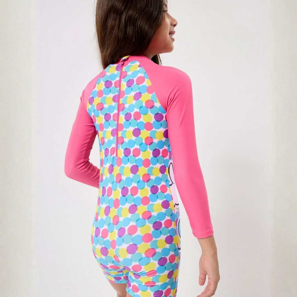 La parte frontal presenta un estampado alegre y colorido, perfecto para la temporada de verano, mientras que las mangas lisas aportan un contraste moderno y divertido. Es una prenda funcional, segura y muy cómoda, ideal para pileta, playa o actividades acuáticas.