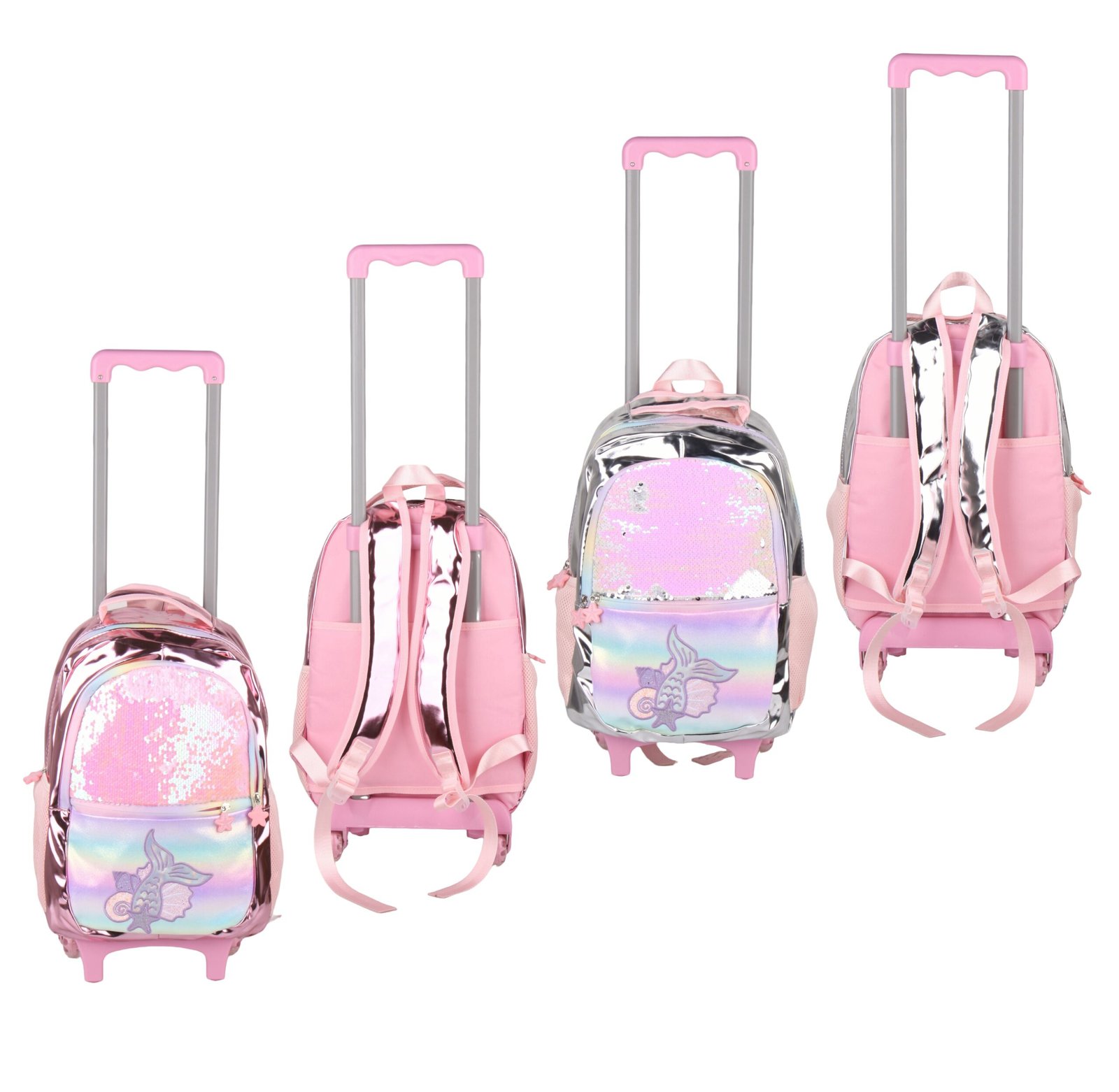 Mochila escolar para nena La Chapelle con carro, ideal para el uso diario escolar. Diseñada para combinar funcionalidad y estilo, cuenta con un atractivo diseño infantil en tonos rosados y detalles brillantes que la hacen llamativa y divertida.