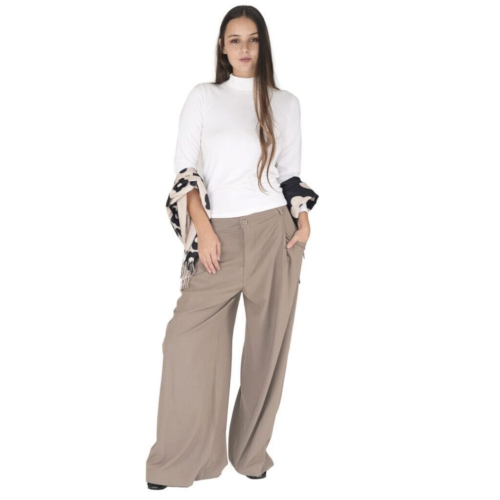 Elegancia y comodidad en una misma prenda. Con su silueta amplia y caída fluida, este palazo se convierte en un aliado ideal para un look sofisticado y moderno. Su diseño de tiro alto y pinzas delanteras estiliza la figura, mientras que el tono neutro lo hace versátil y fácil de combinar con camisas, blusas o tops ajustados.